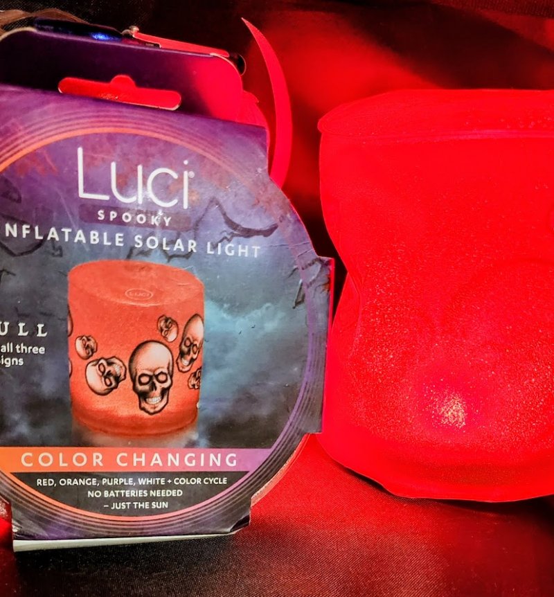Luci Spooky Halloween Inflatable Solar Light Total Solar Power No Batteries Required Lightweight and Waterproof Just inflate and charge (can be charged deflated also) Can cycle through all colors or steady on in purple, orange, red, or white. 1 Design left: Skulls